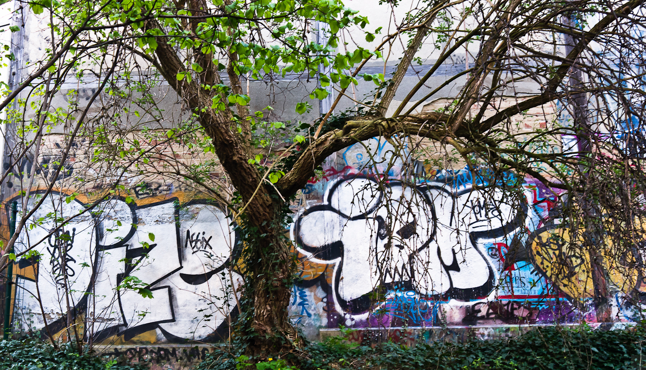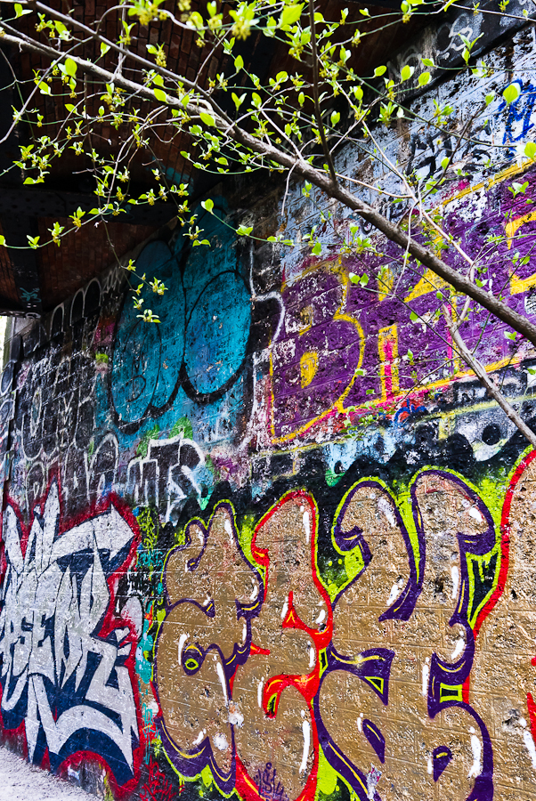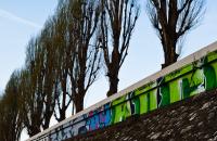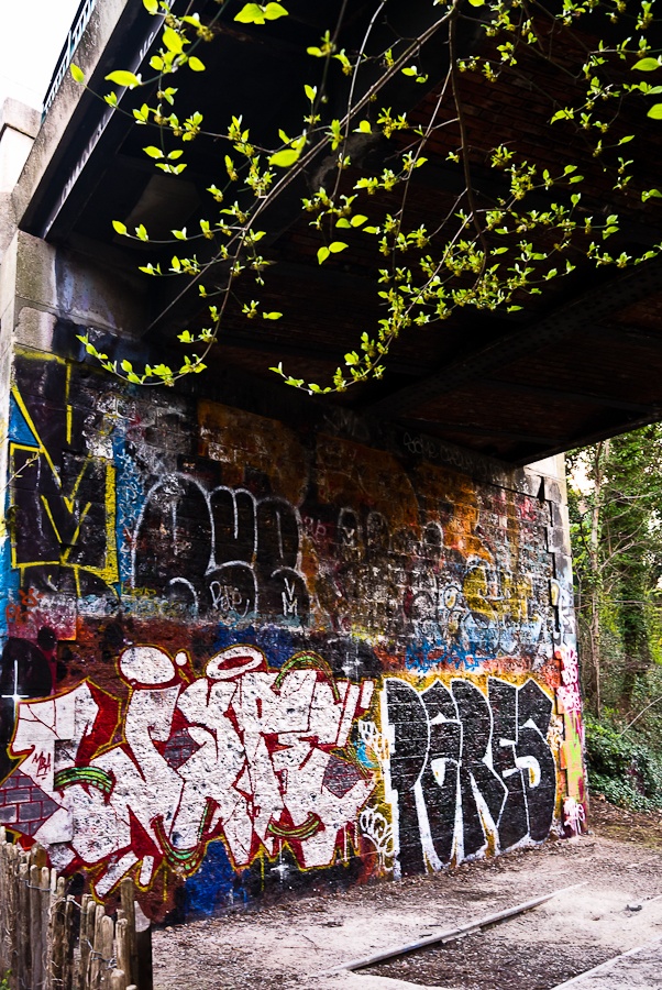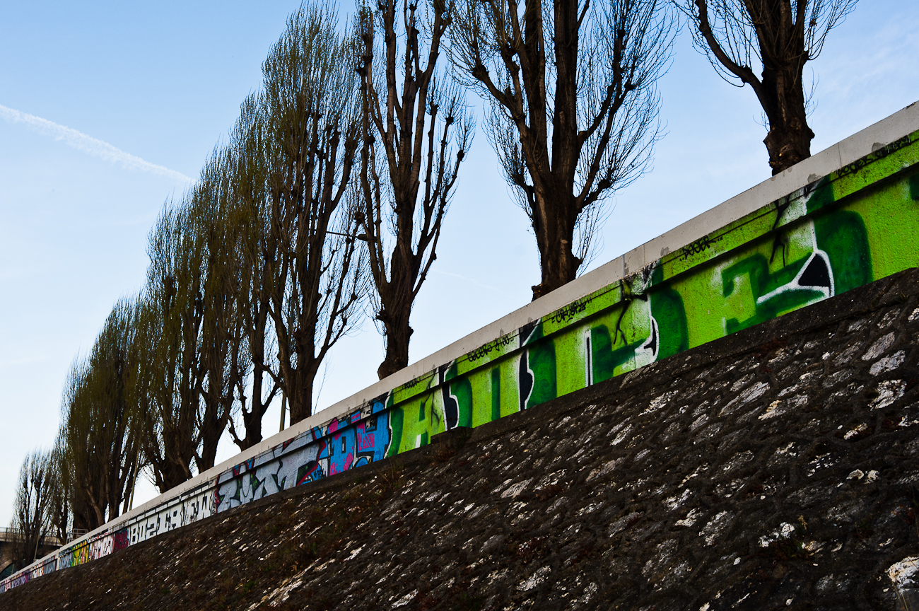 Les tags ont fleuri pendant l'hiver. Les murs à nus leur ont offert l'espace vital pour proliférer. Avec l'arrivée du printemps, la nature commence à reprendre le dessus. Le vert, le beige et d'autres couleurs subtiles remplacent les teintes fluo... Les tags se taillent alors vers les portails le long des rails. Fuyant les barreaux réducteurs, ils se réfugient au bord de l'eau, là où de tout temps des tags éphémères ont été dessinés de la pointe des cannes à pêche...