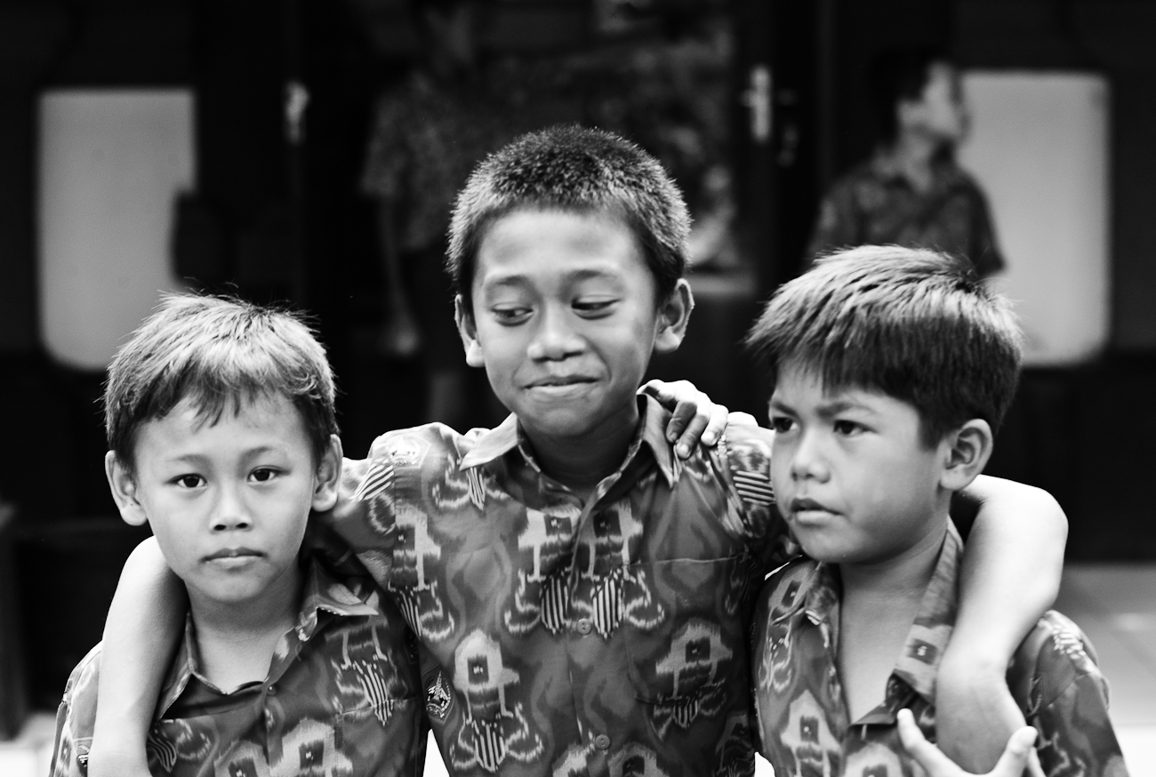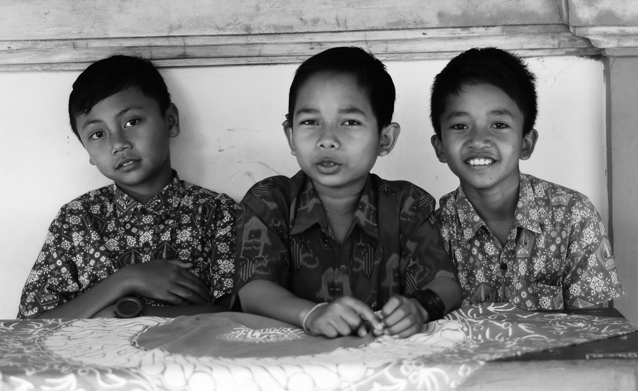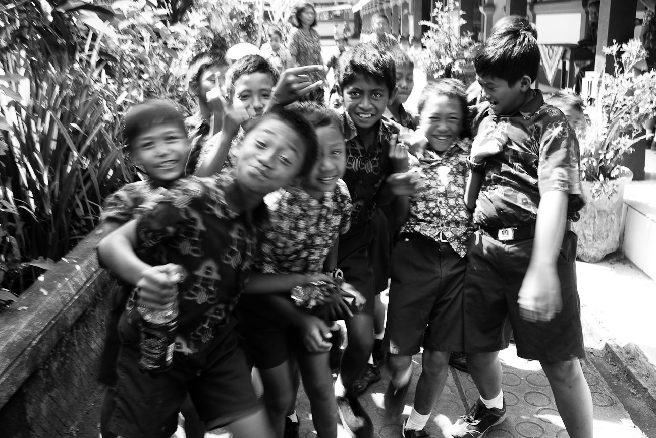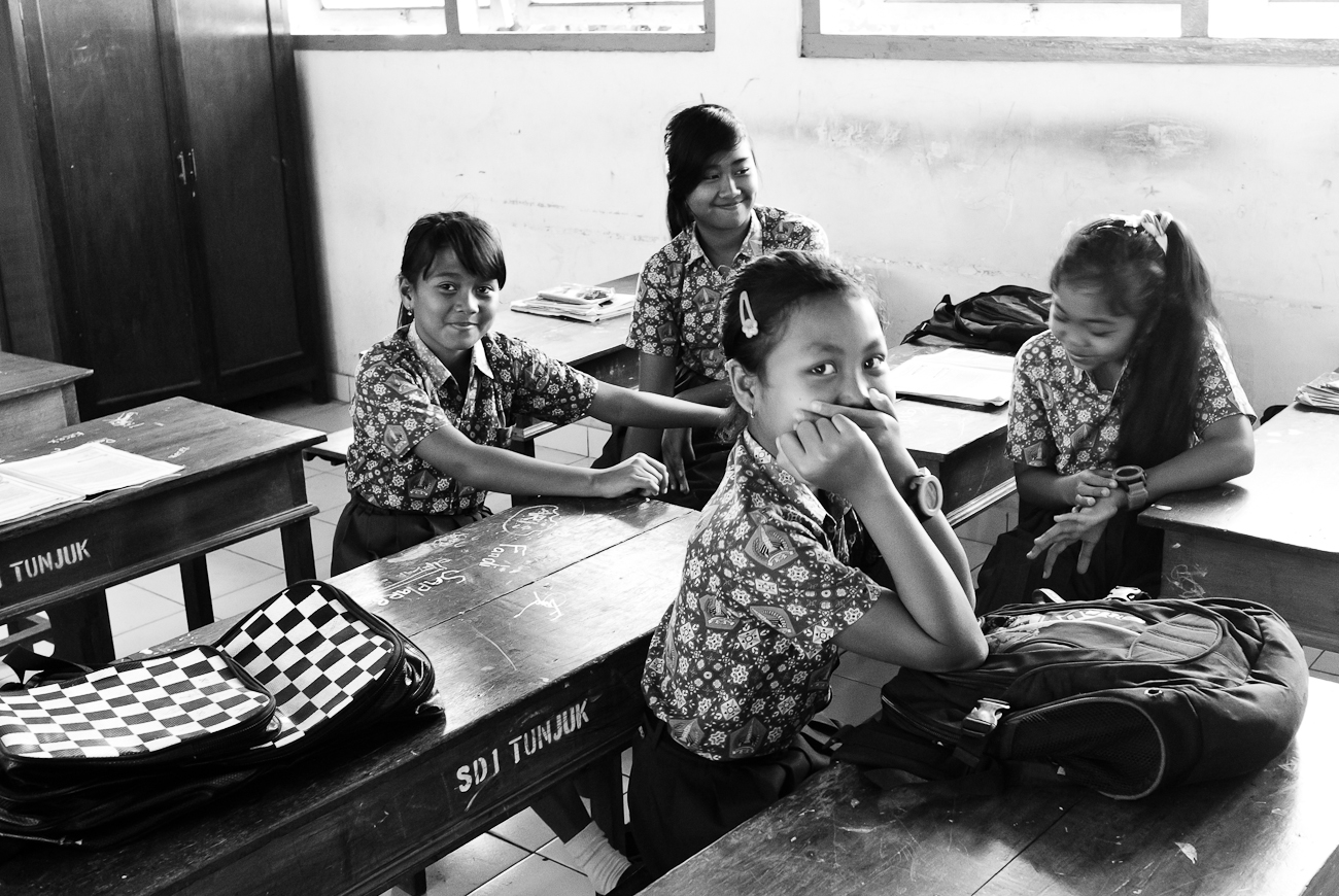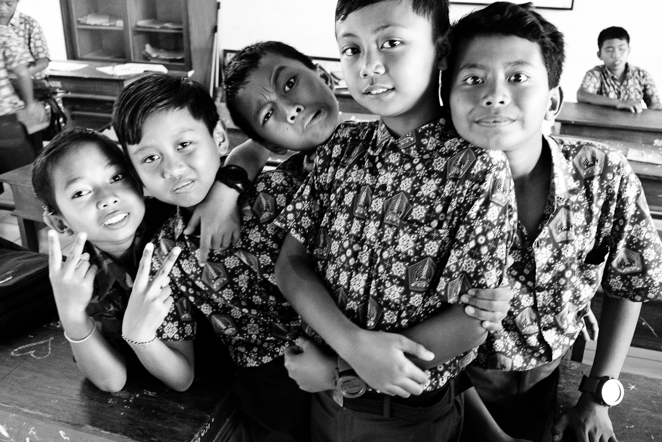 Une école à Bali, perdue au milieu des rizières en pleine campagne, mais tellement semblable à ce que l’on pourrait trouver en France. Les filles studieuses, les garçons insouciants. Le rigolo, le travailleur… Nullement intimidés, ils étaient heureux de me montrer combien l’ouverture sur le monde était importante. L’anglais est hésitant, mais l’envie de partager leur fait accomplir des miracles. Ils savent qu’ils ne veulent plus travailler aux champs et qu’ils ont une chance extraordinaire de fréquenter cette école…
