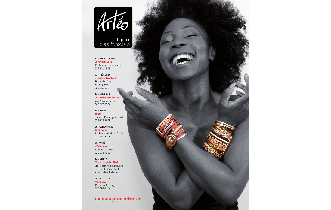 Cahier des charges : Bijoux en couleur sur fond N&B pour faire ressortir les matières nobles utilisées, et la qualité des produits, mannequin naturelle et heureuse qui doit attirer l’œil sans focaliser l’attention par rapport aux bijoux, format portrait en laissant de la place pour le logo et l’adresse des magasins, shooting en ½ journée maquillage compris